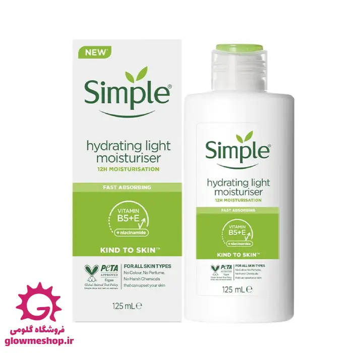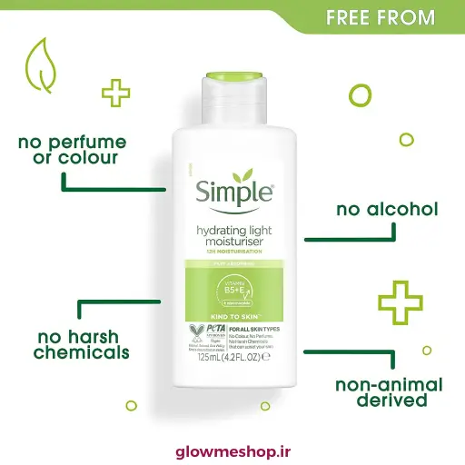 کرم مرطوب کننده سیمپل مدل لایت Simple Hydrating Light Moisturiser cream یکی از محصولات برجسته و موفق از برند معتبر و قدیمی انگلیسی Simple است که با استفاده از ترکیبات ساده و بدون مواد شیمیایی مضر، به تولید محصولات مراقبت از پوست میپردازد. این کرم بافتی بسیار سبک دارد که به سرعت در پوست نفوذ کرده و آن را به مدت 12 ساعت مرطوب و شاداب نگه میدارد. کرم مرطوب کننده سیمپل مدل لایت با فرمولاسیونی که کاملاً گیاهی است و هیچگونه پایه حیوانی ندارد، برای همه انواع پوست، بهویژه پوستهای حساس، مناسب است.